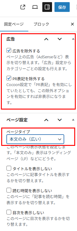 また、そのほかにも、情報量の少ないページに広告を出すことによる「有用性の低下」を防ぐため、お問い合わせページ、プロフィールページをプライバシーポリシーページと同様に広告除外設定し、見やすいように「本文のみ」の表示に設定しなおしました。