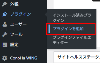 そして管理画面左側にあるメニューの「プラグイン」から「プラグインを追加」をクリック。