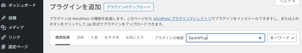 すると「プラグインを追加」画面が表示されるので、検索窓に「BackWPup」と入力しましょう。