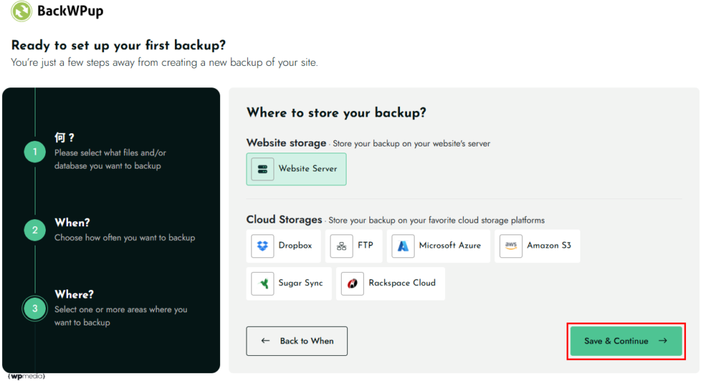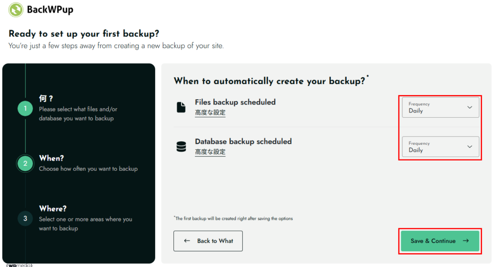 「ファイル」と「データベース」にチェックが入っていることを確認して、「Save & Continue」ボタンを押しましょう。