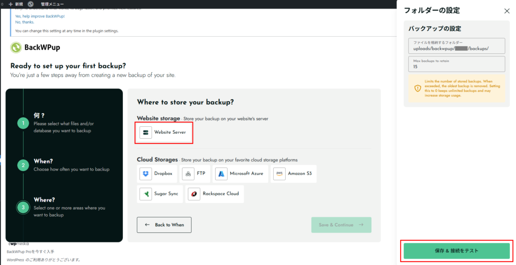 「Website Server」をクリックしたら、右側からスーッと「フォルダーの設定」ポップアップが出てくるので、「保存&接続をテスト」ボタンを押します。