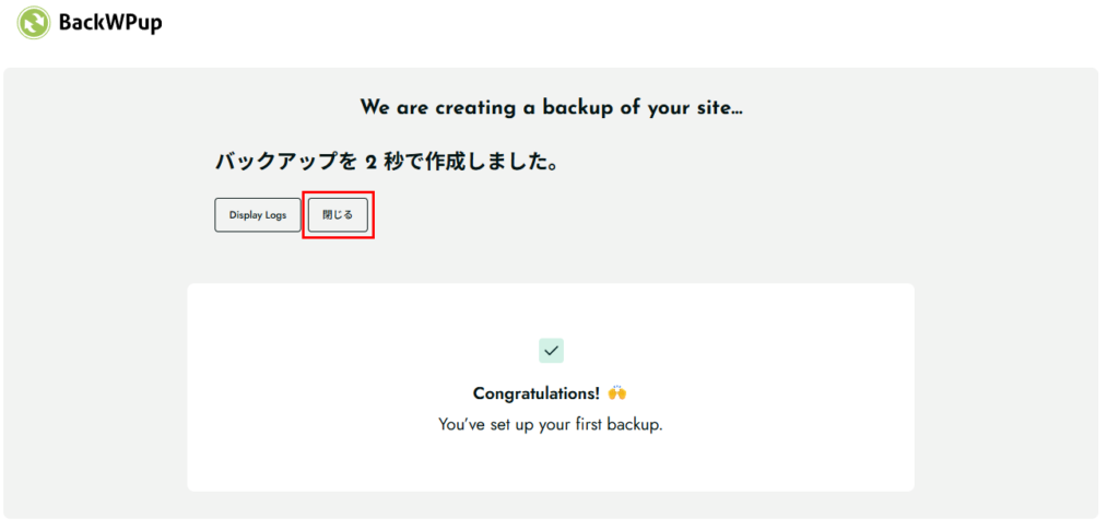 これでバックアップの設定ができました。「閉じる」ボタンを押した直後は以下の画面に移動しますが、しっかりバックアップの設定ができています。