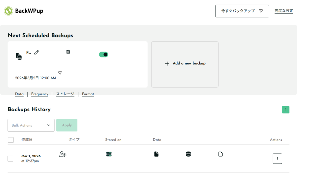 「後からバックアップの頻度を変更したい」とか「ファイルとデータベースのバックアップタイミングずらしたい」とかの設定も可能ですので、それらの設定方法もいずれ記事にしていきたいと思います。