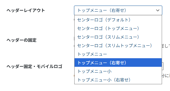 「ヘッダーレイアウト」の部分で「トップメニュー(右寄せ)」を選択しましょう。