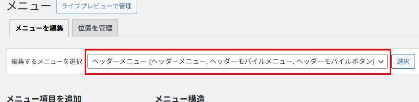 編集するメニューがちゃんとヘッダーメニューのものになっているか確認してください。(もしフッターメニューなどが選択されている状態なら、ヘッダーメニューを選んで「選択」ボタンを押します。