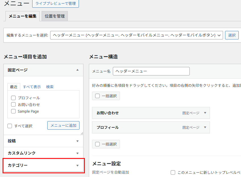 続いて、ナビゲーションメニューの中にカテゴリーを追加していきます。