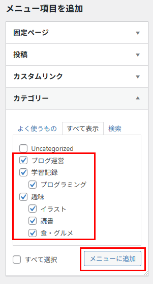 現在作成しているカテゴリーを、子カテゴリー含めすべて選択して「メニューに追加」ボタンを押します。