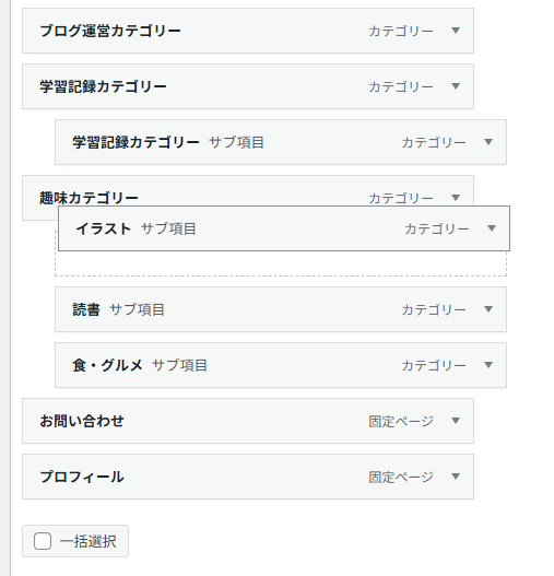 以下の画像のように、通常より少し右を狙って項目を移動させると、入れ子のように配置されます。親カテゴリーと子カテゴリーは入れ子になるように並び替えていきましょう。