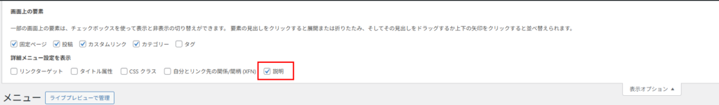 その説明文を非表示にしたい場合は、メニュー設定から説明文を削除していく必要があります。