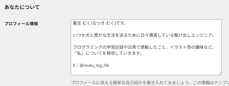 プロフィールは、訪問者に「どんな人が書いているか」を伝えるために重要な項目です。