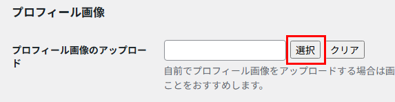 下の方にスクロールしていくとプロフィール画像の設定欄があるので、「選択」ボタンでメディアライブラリを開き、設定したい画像をアップロードしましょう。