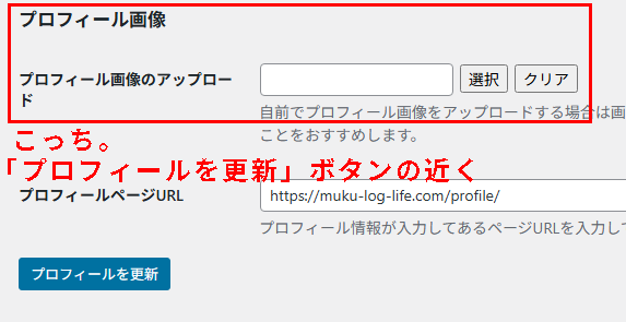 プロフィール情報の入力欄のすぐ下に「プロフィール写真」という項目がありますが、設定するのはここじゃないです!