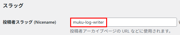 投稿者スラッグの入力欄下部にも説明書きがありますが、ここは投稿者アーカイブページのURLなどに使用されます。