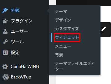 まずはWordPress管理画面左側メニュー「外観」→「ウィジェット」をクリックします。