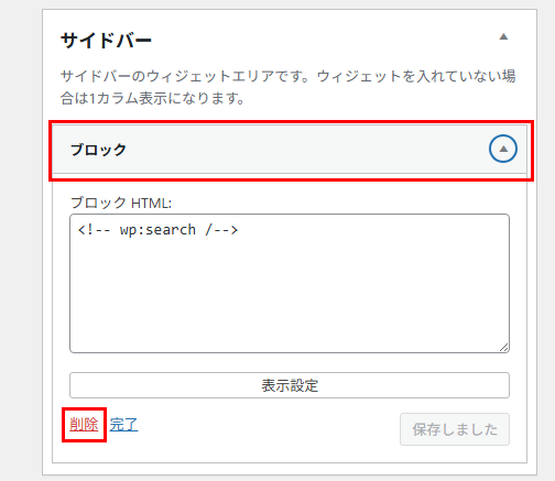 最初は「ブロック」というウィジェットが入っていると思いますので、対象のウィジェットをクリックして詳細設定画面を表示し、「削除」ボタンで削除していきましょう。