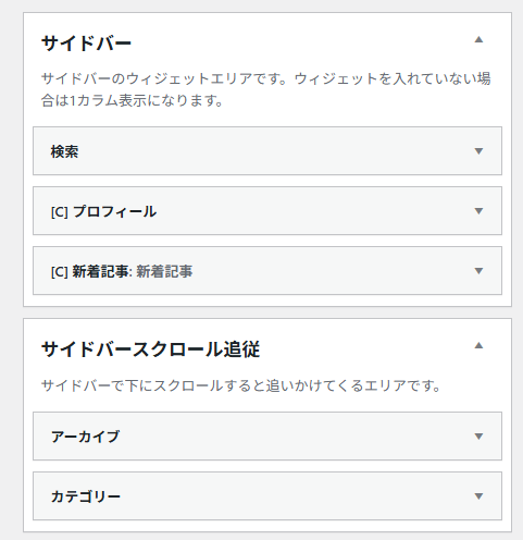 表示される画面に右側の方に、「サイドバー」と「サイドバースクロール追従」という項目がありますが、ここに入っているウィジェットがサイドバーに表示されます。