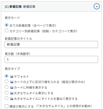 たとえば「新着記事」ウィジェットであれば、詳細設定から「表示させる記事の数」や「表示させる際の見た目」などをカスタマイズできます。