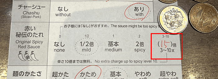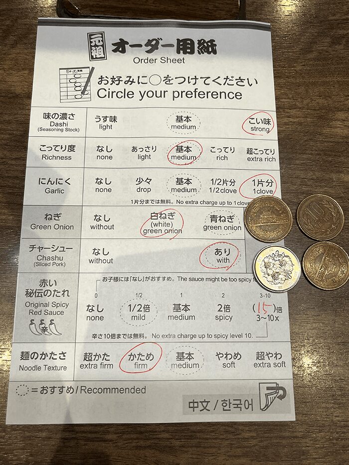発券したらお店のスタッフの案内に従って席につき、席にあるオーダー用紙の「味の濃さ」や「こってり度」などに丸を付けていきます。