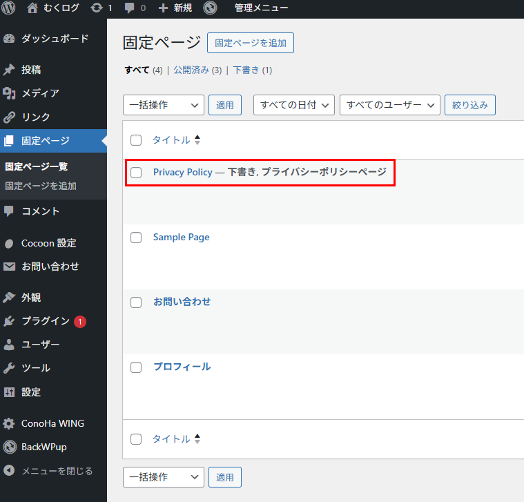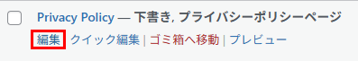 WordPress管理画面の「固定ページ」をクリックしたら一覧画面が出ますが、そこに「Privacy Policy」というタイトルの記事があります。