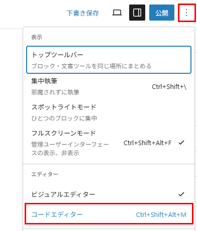 その後、編集画面右上のメニューアイコンを開いて「コードエディタ」を選択します。