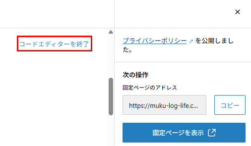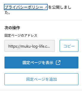 「プライバシーポリシーを公開しました」と出れば完了です。「固定ページを表示」から見た目を確認することができます。