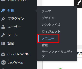 まずは管理画面の「外観」→「メニュー」から、メニューの編集画面を表示します。