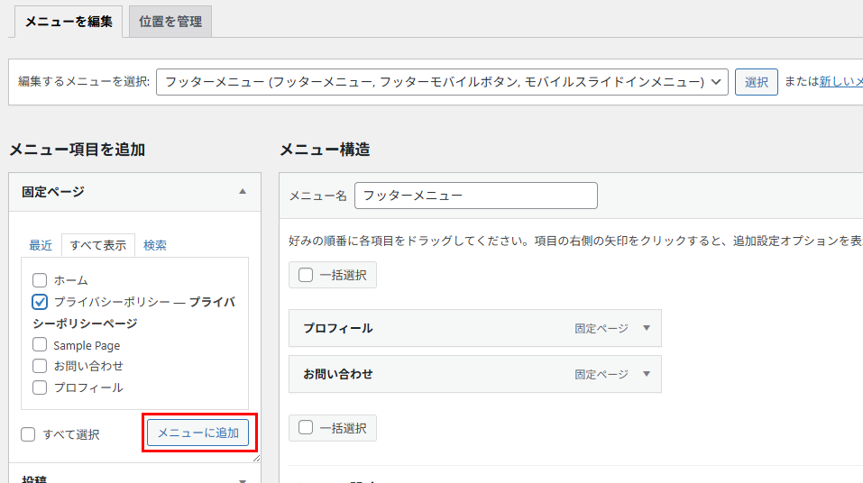 「編集するメニューを選択」で「フッターメニュー」が選択されていることを確認し、「メニュー項目を追加」の選択欄から「プライバシーポリシー」にチェックを入れます。