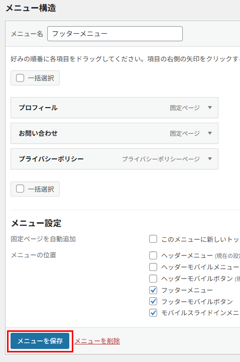 「メニュー構造」のところに「プライバシーポリシー」が追加されますので、「メニューを保存」をクリックします。