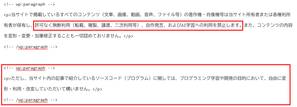 自作発言と、文章や画像に対してのAI学習禁止、ただしソースコードについては学習自由の文言を追加しています。