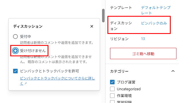 プライバシーポリシーページにコメントがきても仕方がないので、コメント機能はOFFにしておきます。