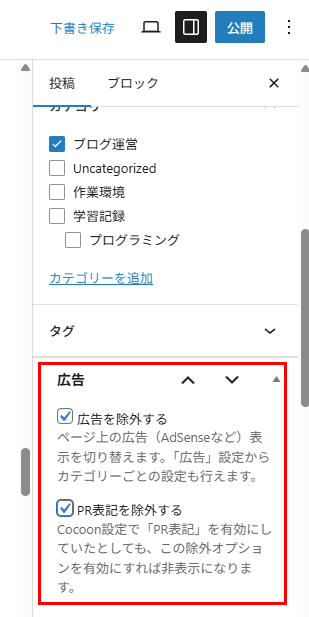 PR表記というのは、「このページには広告が含まれていますよ」という目印の表記のことです。広告表示しないので一緒に除外設定します。