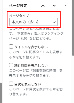 さらに、プライバシーポリシーページにサイドバーがあるのも、SNSのリンクがあるのも嫌だなと思ったため、編集画面のページ設定にてページタイプを「本文のみ(広い)」にしています。