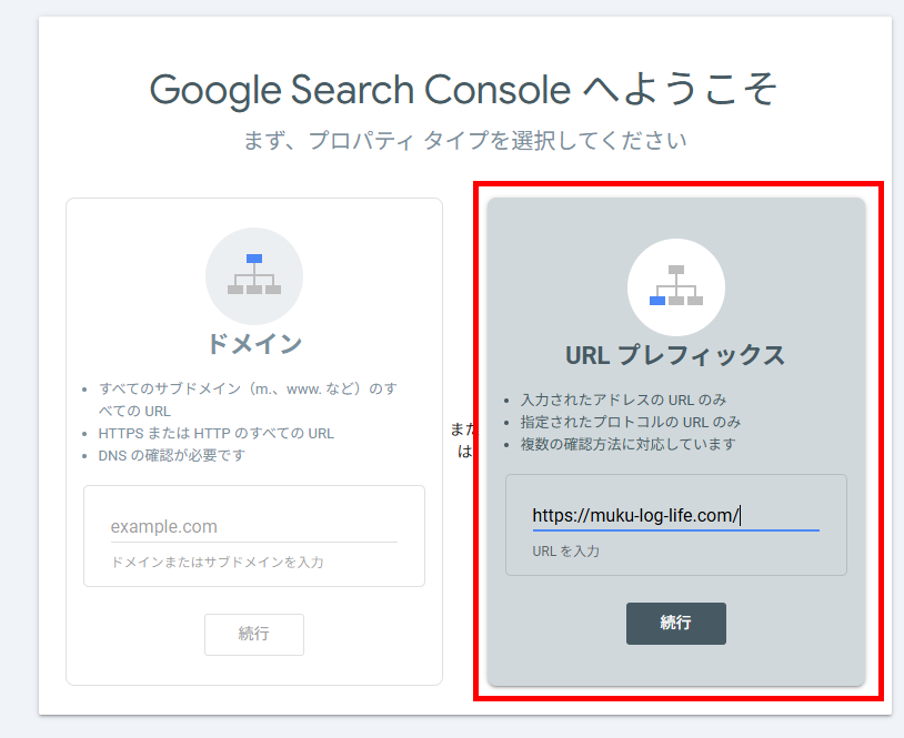 右側の「URLプレフィックス」の入力欄に自分のサイトのURLを入れて、「続行」を押します。