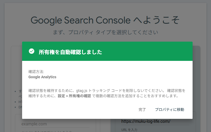 私はこの後「プロパティに移動」でサーチコンソールの管理画面に移動して、いつでもすぐに開けるようブックマークしましたが、そのままブラウザを閉じてしまっても問題ありません。