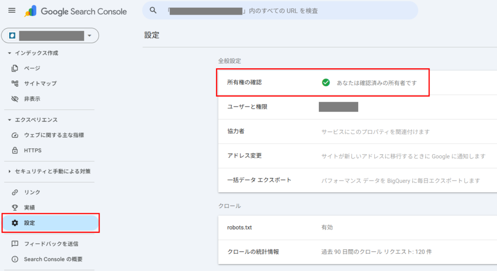 「本当に設定完了しているの?」と気になる方は、サーチコンソールの管理画面の「設定」をクリックし、「所有権の確認」の項目を確認してください。